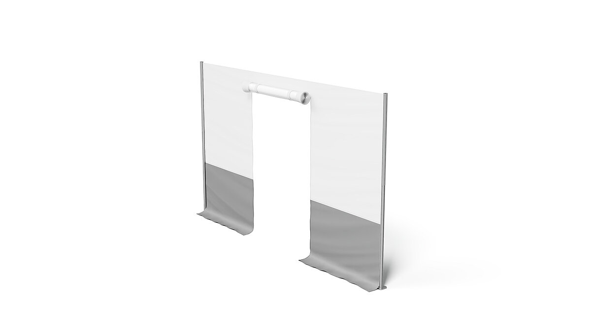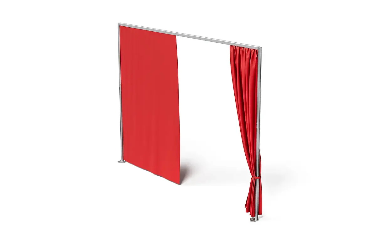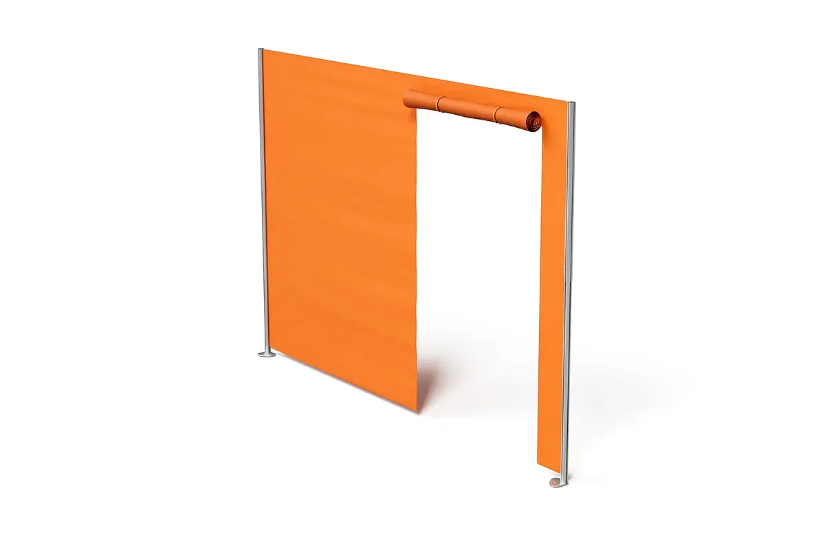 The door is opened using two full-length zippers and rolled up at the top for fixation. A practical solution for booths at trade shows and markets or as access to internal cabins when curtains aren’t desired. Available in all standard colors and custom-printable.