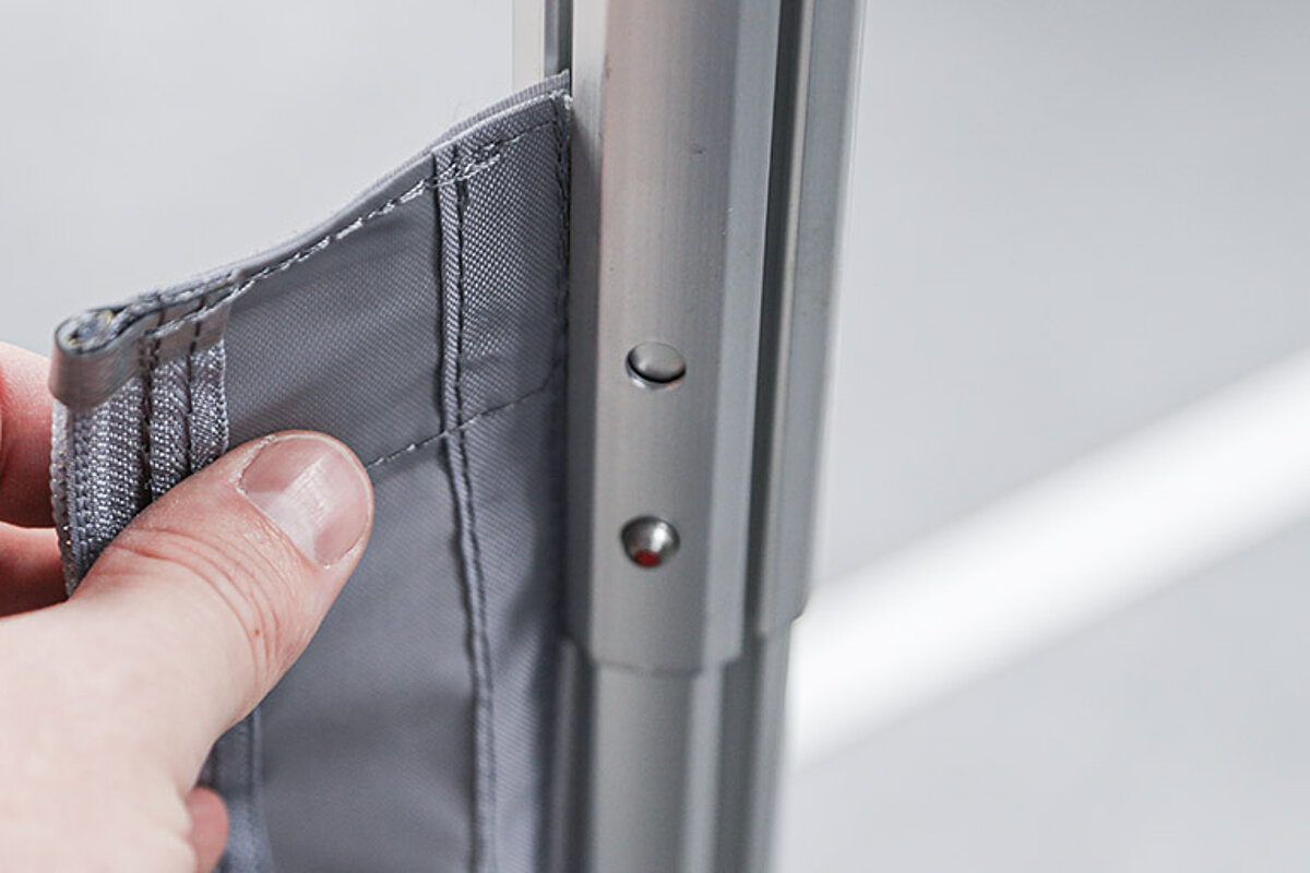 Our side walls are attached to the Pro-Tent 2000 using classic Velcro fasteners. In the Pro-Tent MODUL 4000 and Pro-Tent 5000 folding tent series, the Pro-Tent side walls are attached with a piping that is inserted into the system groove of the Omega profile. The alternative version with Velcro fasteners is available as an option for these series.