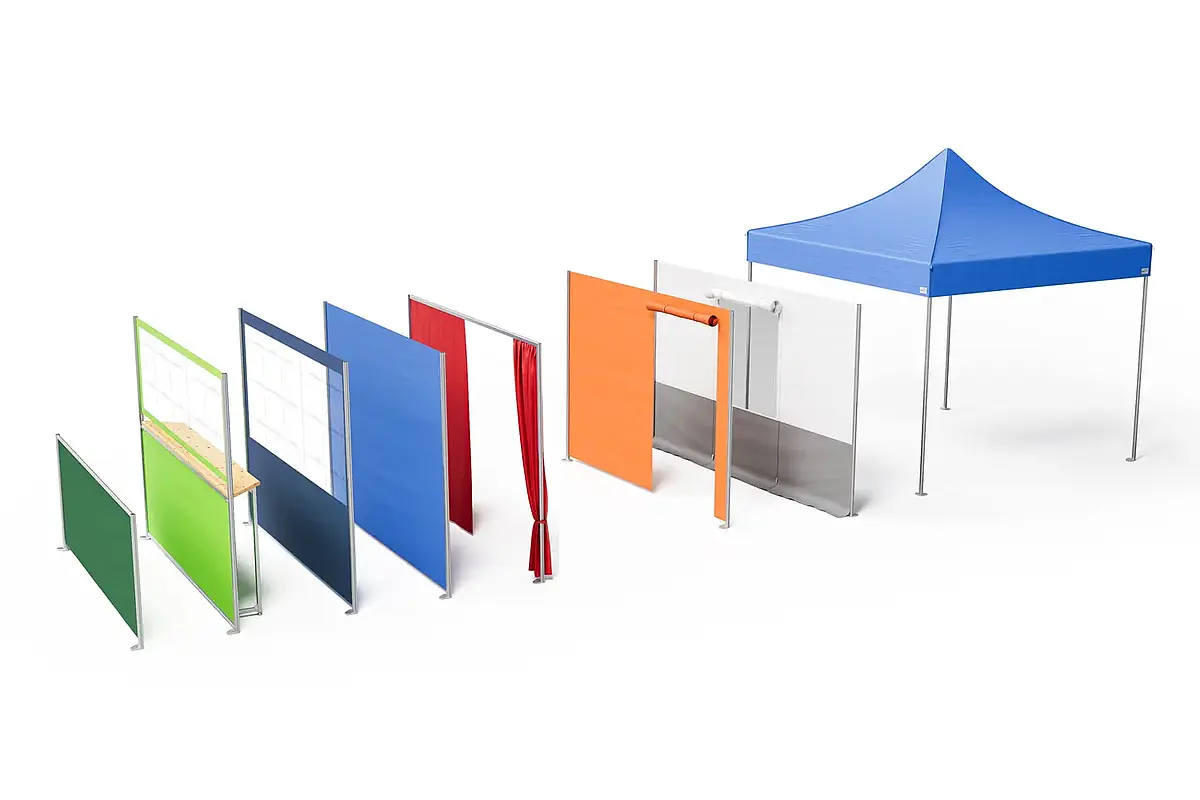 Sometimes special solutions are needed. Our special walls deliver: with extra-long PVC skirts and a combined door and window opening, they’re ideal where increased protection is required. The window includes an integrated fly screen and privacy shield. These special walls come in all standard colors and can be custom-printed. PVC skirts are available in white, grey, and black.