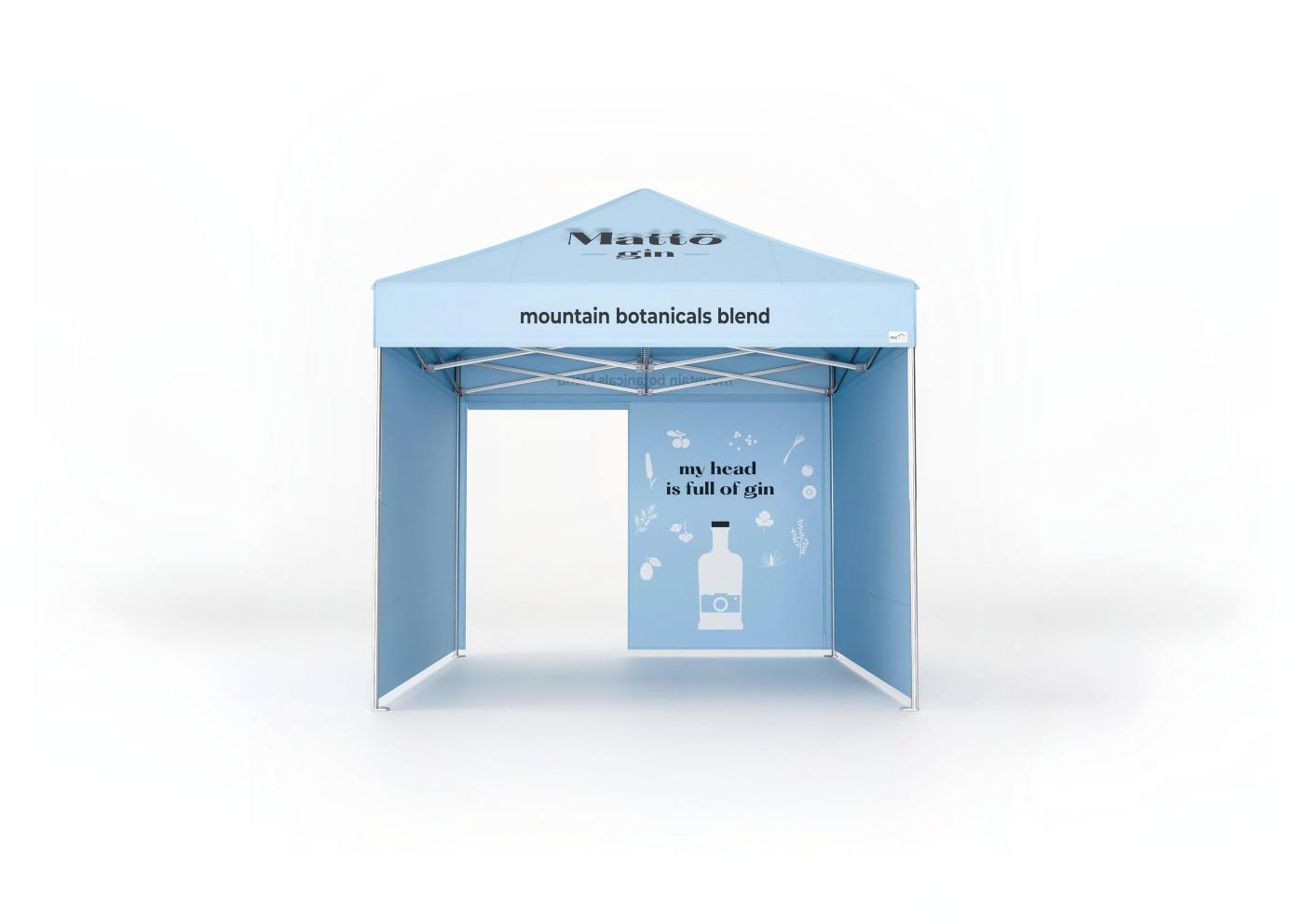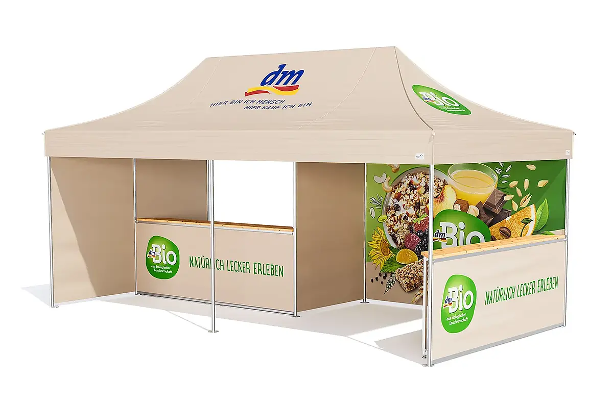 Turn your Pop-up Gazebo into a professional sales or info booth in no time! The half-height side wall with premium Pro-Tent counter provides a functional display surface. A second closable wall, mounted above the counter with zippers, allows you to securely close your booth as needed. Perfect for events, markets, or trade shows where you want to present products or provide information effectively. Available in all standard colors and custom-printable.