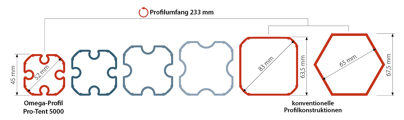 Bei Pro-Tent setzen wir nicht auf dicke Rohre, sondern auf kluge Konstruktion. Auch das beweist unser 16-fach gekantetes Omega-Profil. So erreicht unser Profil des Pro-Tent 5000 mit einer Breite von 45 mm und einem Durchmesser von 52 mm, durch die spezielle Form, einen «entfalteten» Profilumfang von beeindruckenden 233 mm.