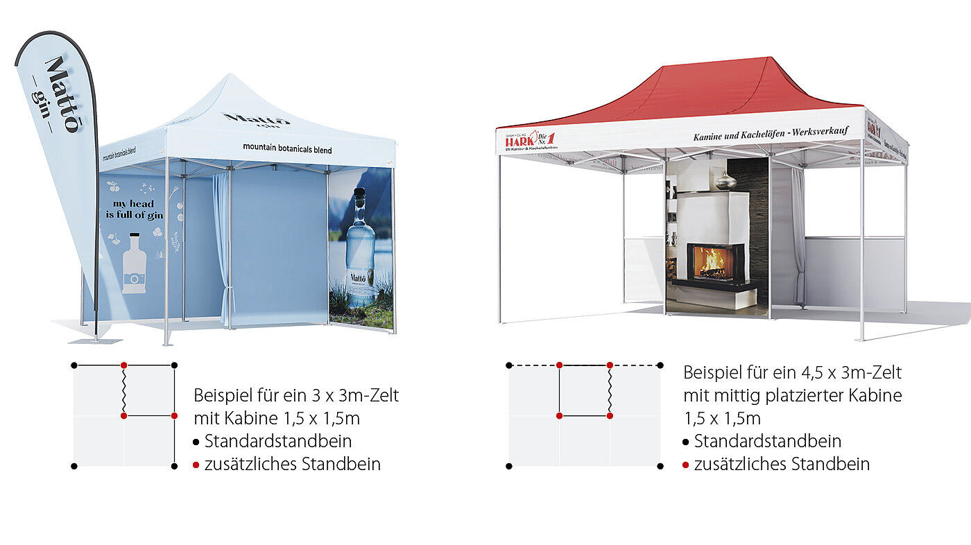 Dank der Möglichkeit zusätzliche Standbeine* zu platzieren, können bei den Serien Pro-Tent MODUL 4000 und Pro-Tent 5000 mit zusätzlichen Querverbindern und wenigen Handgriffen bei jedem Zelt individuelle Raumunterteilungen vorgenommen oder auch Innenkabinen eingerichtet werden – ideal z. B. als Stauraum oder Umkleide nutzbar.