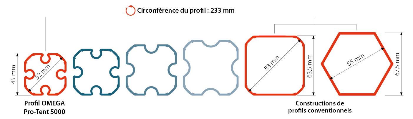 Chez Pro-Tent, nous misons sur une conception intelligente plutôt que sur des tubes épais. Notre profilé Omega à 16 arêtes en est l’illustration parfaite. Avec sa largeur de 45 mm, son diamètre de 52 mm et sa forme spéciale, le profilé « déplié » de la Pro-Tent 5000 atteint la longueur impressionnante de 233 mm.