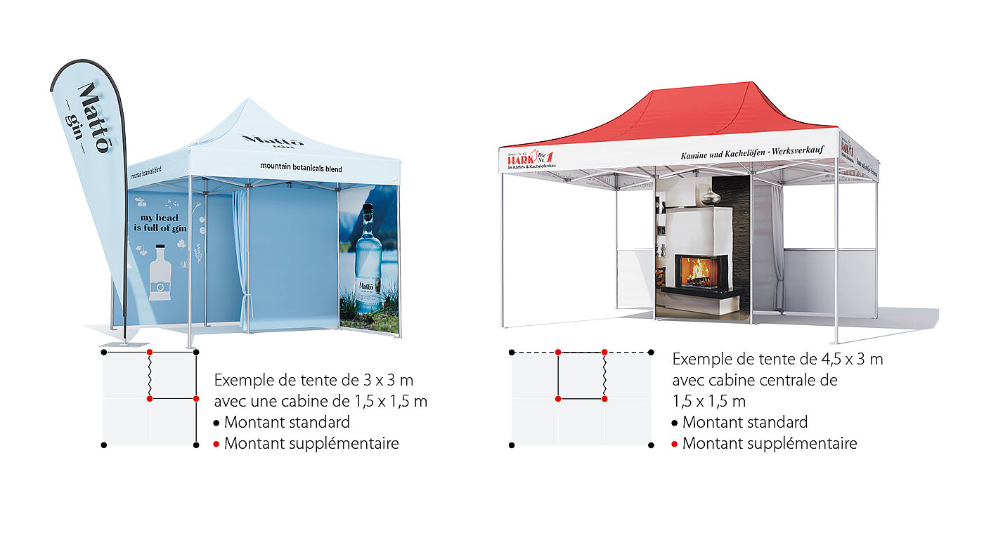 Grâce à la possibilité d’ajout de montants* sur les séries Pro-Tent MODUL 4000 et Pro-Tent 5000, il est possible de diviser l’espace à l’aide de traverses de connexion ou de créer des cabines intérieures en quelques gestes – une solution idéale, par exemple, pour les espaces de rangement ou les vestiaires.