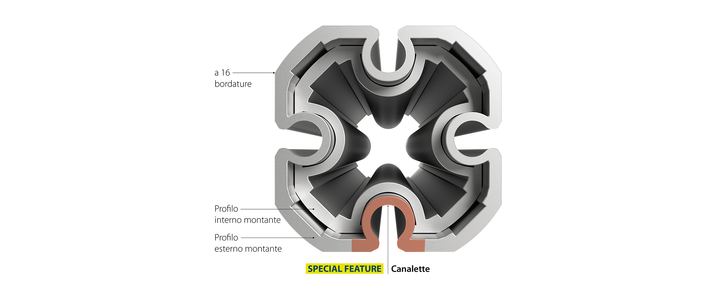 È la struttura del profilo a fare la differenza: quella di Pro-Tent è a 16 bordature – per la massima stabilità. Ed è la sola ad avere le caratteristiche canalette: l’incastro diretto nelle canalette assicura alle pareti impermeabilità e resistenza al vento, mentre per fissare i connettori trasversali e gli altri accessori nel profilo bastano dei tenditori a vite e una semplice rotazione manuale.