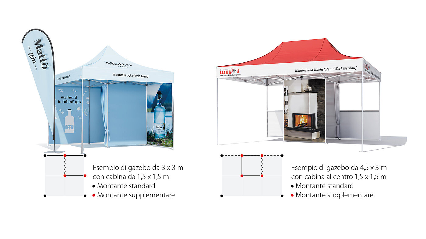 Grazie alla possibilità di installare montanti extra* , nelle serie Pro-Tent MODUL 4000 e Pro-Tent 5000 è possibile personalizzare ogni gazebo separandone gli spazi, oppure creando delle cabine interne, ideali come ripostiglio o come camerino: basta qualche connettore trasversale supplementare e poche semplici manovre.