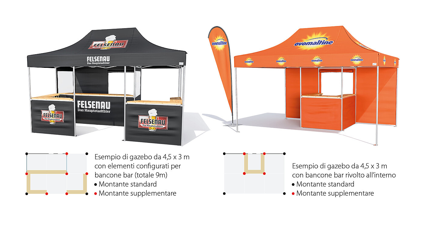 Pro-Tent offre un’ampia gamma di accessori per adattare alla perfezione il tuo gazebo a qualsiasi utilizzo: Diverse pareti, tettoia, grondaia, sistema di illuminazione o anche il nostro bancone bar di alta qualità: con pochi gesti potrai trasformare il tuo gazebo in una mescita, in un banco merci o in un service point .